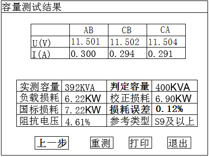 實(shí)測(cè)容量:該項(xiàng)顯示實(shí)際測(cè)量的變壓器的容量。