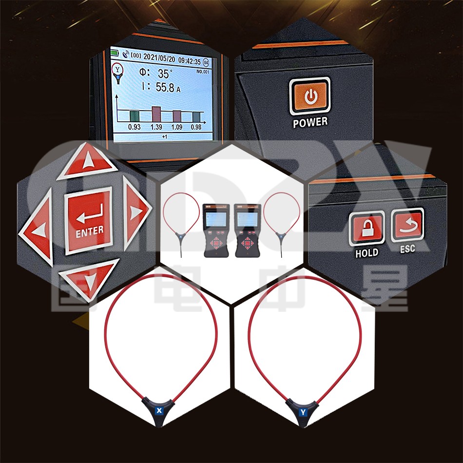 4. 接收機:為手持設備,3.5寸彩色液晶屏,內(nèi)置高速微處理器、GPS定位模塊,結(jié)合精準算法,時時分析顯示被測電纜的電流、相位、及電流趨勢。可測交流電流量程為AC 0.00A~2000A(50Hz/60Hz),相位1°~360°。